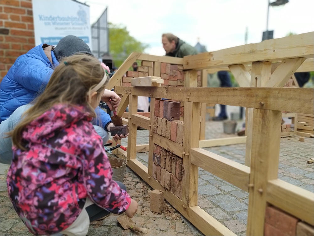 Die Kinderbauhütte startet wieder in die Freiluftsaison. Dann heißt es wieder: Ran an die Werkzeuge! Kinder bauen mit kindgerechten Werkzeugen und Materialien ein Fachwerkhaus im Maßstab 1:3 auf. Wie in frühen Zeiten wird bei der Kinderbauhütte mit Hammer und Säge, mit Lot und Winkel gearbeitet. Historisches Bauen von Fachwerkgebäuden wird ganz praktisch ausprobiert: Lehmziegel können in maßstabsgerechten Formen selber hergestellt und das Fachwerk mit Flechtwerk und Lehmgemisch gefüllt werden. Ausprobieren ist explizit gewünscht!