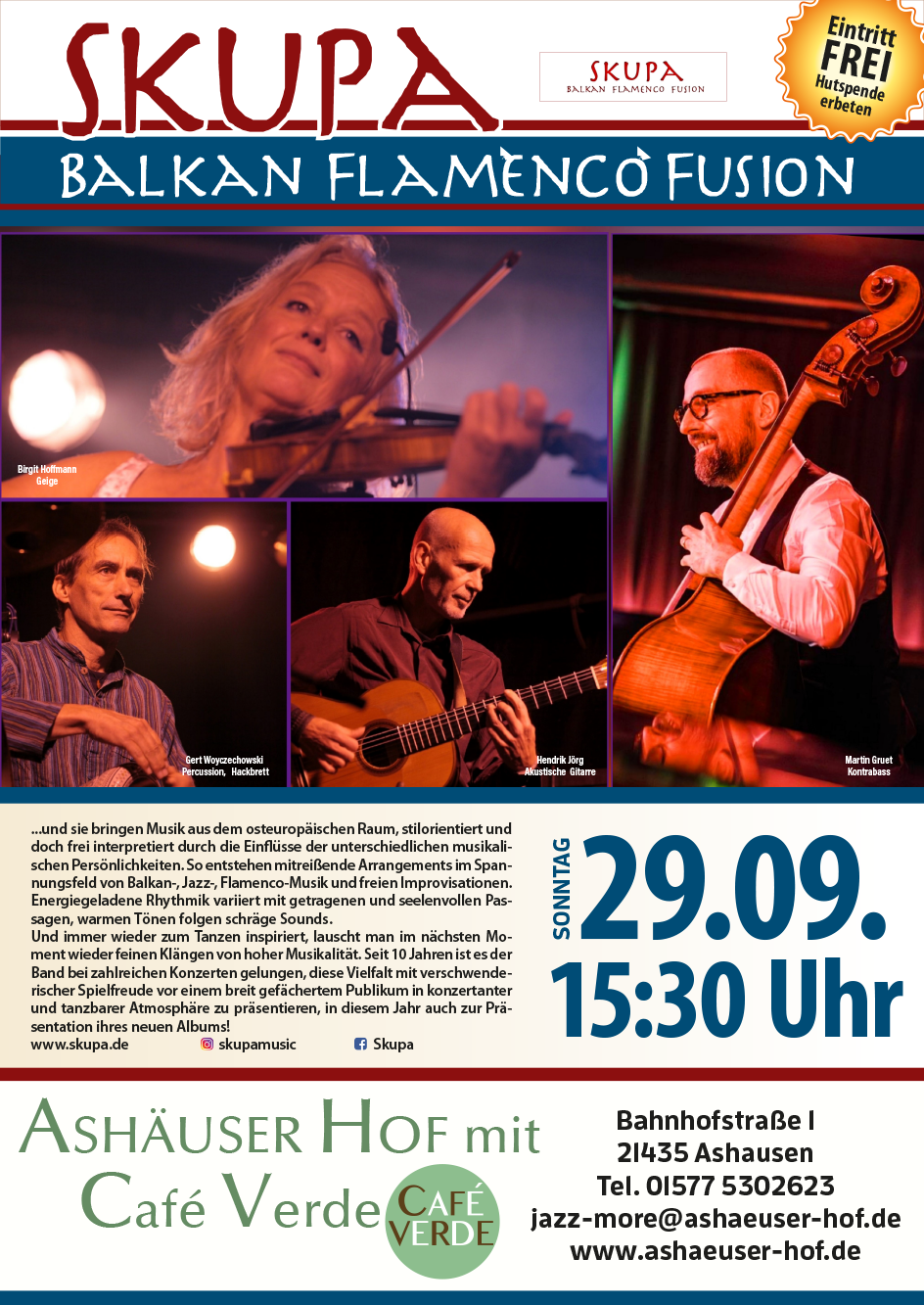 Musik aus dem osteuropäischen Raum. Mitreißende Arrangements im Spannungsfeld von Balkan/Jazz/ Famenco-Musik präsentiert Skupa auch ihr Neues Album.