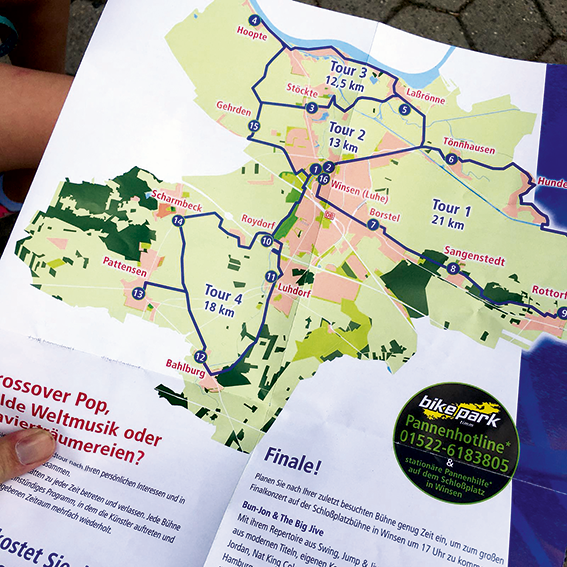 Über 35 Live-Acts werden an 16 Standorten in der Innenstadt und in allen 13 Ortsteilen von 11 – 16 Uhr durchgehend großartige und abwechslungsreiche Musik gegen Hutspende darbieten. Nach persönlichem Musikgeschmack und sportlicher Fitness können sich die Teilnehmer ihre eigene Route zusammenstellen. Eine Orientierung gibt die Fahrradkarte im Programm-Flyer, welche drei verschiedene Touren vorschlägt. Die Spielstätten können zu jeder Zeit betreten und verlassen werden. Ehrenamtliche Helfer aus Vereinen, Feuerwehr oder Dorfgruppen bieten an jedem Standort Gegrilltes, selbstgebackenen Kuchen, Kaffee und Getränke zu günstigen Preisen an. Zum Abschluss des Tages treffen sich um 17 Uhr alle Teilnehmer zum großen Finalkonzert auf dem Schlossplatz.